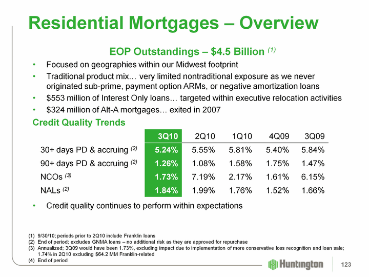 | Residential Mortgages - Overview 123 EOP Outstandings - $4.5 Billion (1)Focused on geographies within our Midwest footprintTraditional product mix... very limited nontraditional exposure as we never originated sub-prime, payment option ARMs, or negative amortization loans$553 million of Interest Only loans... targeted within executive relocation activities$324 million of Alt-A mortgages... exited in 2007Credit Quality TrendsCredit quality continues to perform within expectations (1) 9/30/10; periods prior to 2Q10 include Franklin loans(2) End of period; excludes GNMA loans - no additional risk as they are approved for repurchase(3) Annualized; 3Q09 would have been 1.73%, excluding impact due to implementation of more conservative loss recognition and loan sale; 1.74% in 2Q10 excluding $64.2 MM Franklin-related(4) End of period 3Q10 2Q10 1Q10 4Q09 3Q09 30+ days PD & accruing (2) 5.24% 5.55% 5.81% 5.40% 5.84% 90+ days PD & accruing (2) 1.26% 1.08% 1.58% 1.75% 1.47% NCOs (3) 1.73% 7.19% 2.17% 1.61% 6.15% NALs (2) 1.84% 1.99% 1.76% 1.52% 1.66% |