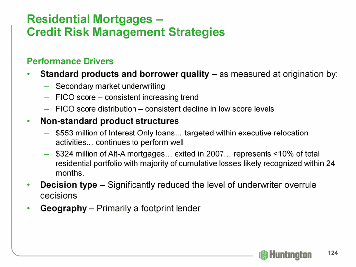 | Residential Mortgages - Credit Risk Management Strategies Performance DriversStandard products and borrower quality - as measured at origination by:Secondary market underwritingFICO score - consistent increasing trendFICO score distribution - consistent decline in low score levels Non-standard product structures$553 million of Interest Only loans... targeted within executive relocation activities... continues to perform well$324 million of Alt-A mortgages... exited in 2007... represents <10% of total residential portfolio with majority of cumulative losses likely recognized within 24 months.Decision type - Significantly reduced the level of underwriter overrule decisionsGeography - Primarily a footprint lender 124 |