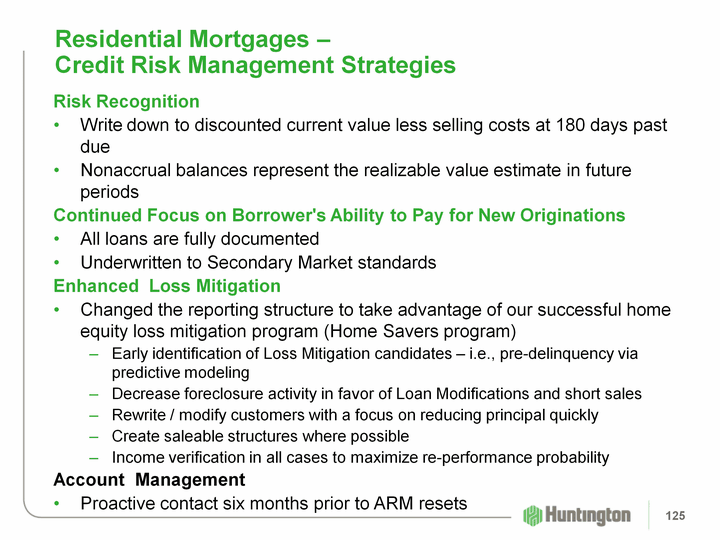 | Residential Mortgages - Credit Risk Management Strategies 125 Risk RecognitionWrite down to discounted current value less selling costs at 180 days past dueNonaccrual balances represent the realizable value estimate in future periodsContinued Focus on Borrower's Ability to Pay for New OriginationsAll loans are fully documentedUnderwritten to Secondary Market standardsEnhanced Loss MitigationChanged the reporting structure to take advantage of our successful home equity loss mitigation program (Home Savers program)Early identification of Loss Mitigation candidates - i.e., pre-delinquency via predictive modeling Decrease foreclosure activity in favor of Loan Modifications and short salesRewrite / modify customers with a focus on reducing principal quicklyCreate saleable structures where possibleIncome verification in all cases to maximize re-performance probabilityAccount ManagementProactive contact six months prior to ARM resets |