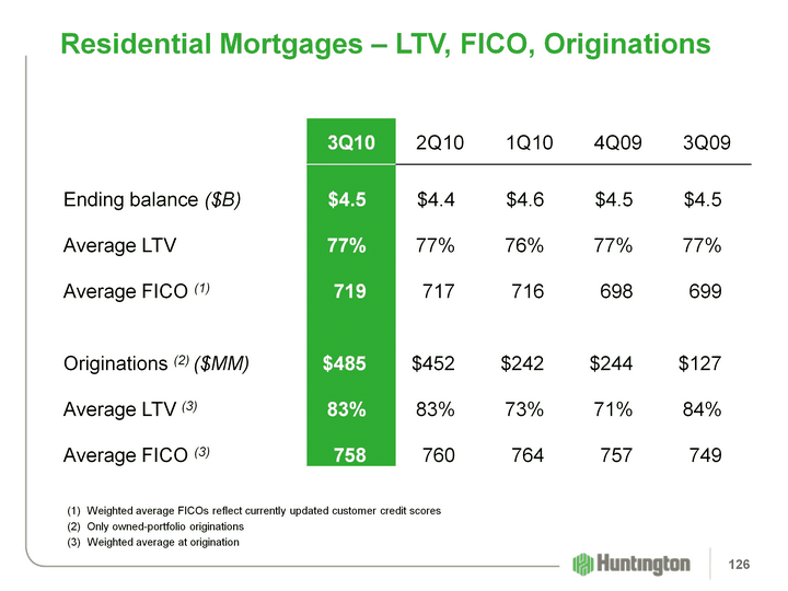 | Residential Mortgages - LTV, FICO, Originations 126 (1) Weighted average FICOs reflect currently updated customer credit scores(2) Only owned-portfolio originationsWeighted average at origination 3Q10 2Q10 1Q10 4Q09 3Q09 Ending balance ($B) $4.5 $4.4 $4.6 $4.5 $4.5 Average LTV 77% 77% 76% 77% 77% Average FICO (1) 719 717 716 698 699 Originations (2) ($MM) $485 $452 $242 $244 $127 Average LTV (3) 83% 83% 73% 71% 84% Average FICO (3) 758 760 764 757 749 |