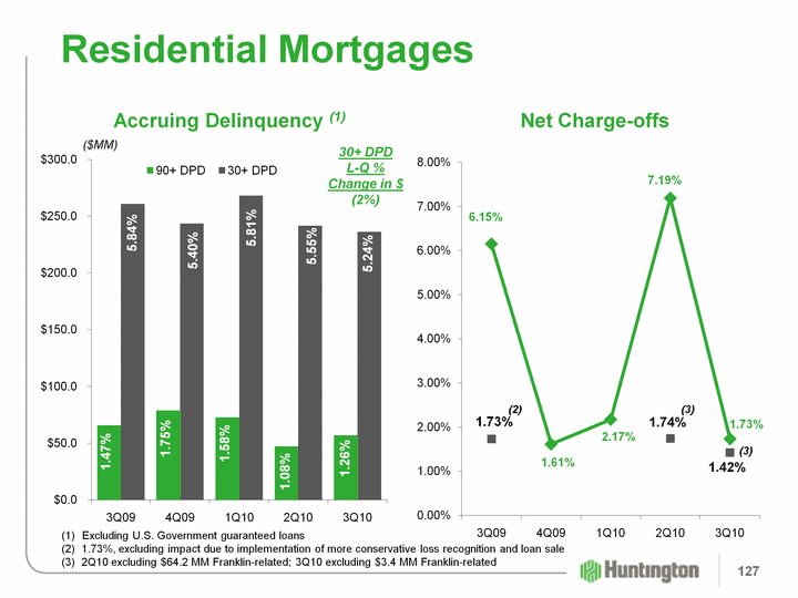| (CHART) Residential Mortgages 127 (CHART) 1.58% 1.08% 1.47% 5.81% 5.55% 5.84% ($MM) 30+ DPD L-Q % Change in $ (2%) 1.75% 5.40% Net Charge-offs Accruing Delinquency (1) (2) (1) Excluding U.S. Government guaranteed loans1.73%, excluding impact due to implementation of more conservative loss recognition and loan sale2Q10 excluding $64.2 MM Franklin-related; 3Q10 excluding $3.4 MM Franklin-related (3) 5.24% 1.26% (3) |