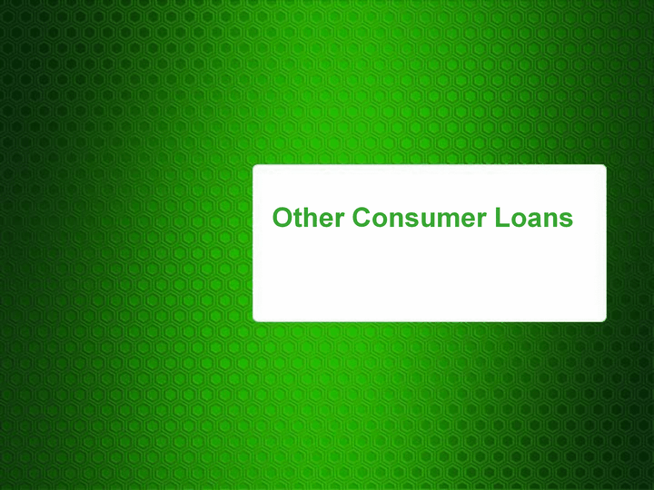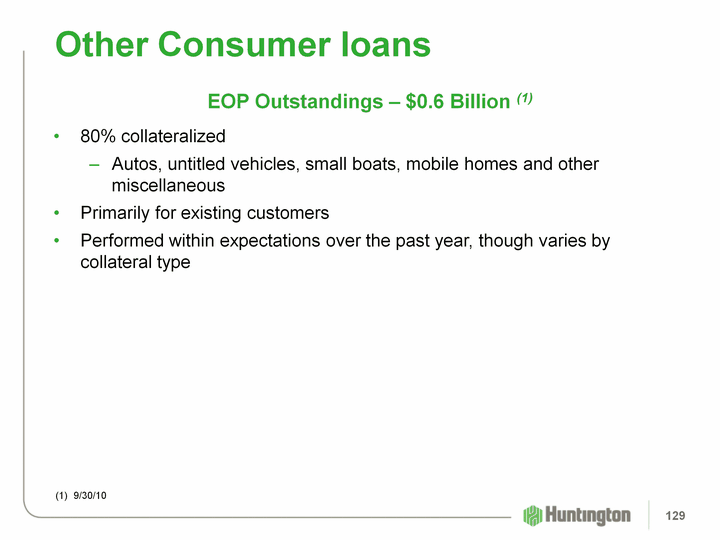 | Other Consumer loans 129 EOP Outstandings - $0.6 Billion (1)80% collateralizedAutos, untitled vehicles, small boats, mobile homes and other miscellaneousPrimarily for existing customersPerformed within expectations over the past year, though varies by collateral type (1) 9/30/10 |