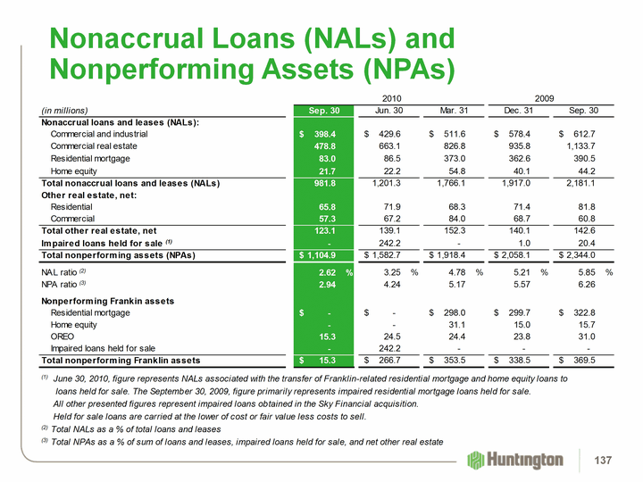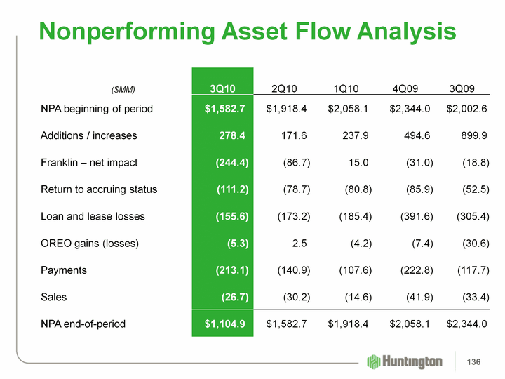 | ($MM) 3Q10 2Q10 1Q10 4Q09 3Q09 NPA beginning of period $1,582.7 $1,918.4 $2,058.1 $2,344.0 $2,002.6 Additions / increases 278.4 171.6 237.9 494.6 899.9 Franklin - net impact (244.4) (86.7) 15.0 (31.0) (18.8) Return to accruing status (111.2) (78.7) (80.8) (85.9) (52.5) Loan and lease losses (155.6) (173.2) (185.4) (391.6) (305.4) OREO gains (losses) (5.3) 2.5 (4.2) (7.4) (30.6) Payments (213.1) (140.9) (107.6) (222.8) (117.7) Sales (26.7) (30.2) (14.6) (41.9) (33.4) NPA end-of-period $1,104.9 $1,582.7 $1,918.4 $2,058.1 $2,344.0 Nonperforming Asset Flow Analysis 136 |