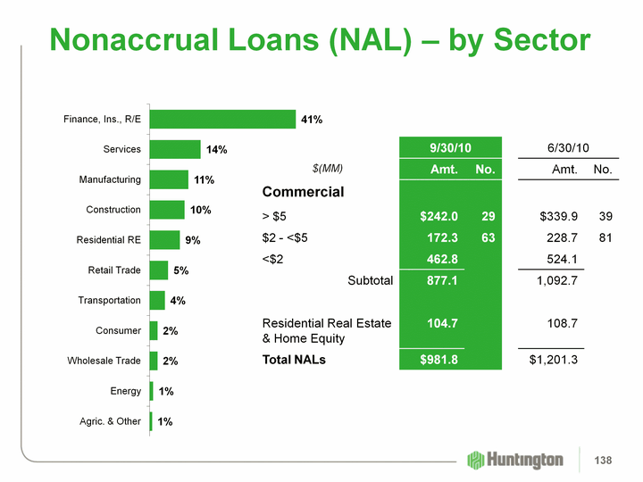 | Nonaccrual Loans (NAL) - by Sector 138 (CHART) 9/30/10 9/30/10 6/30/10 6/30/10 $(MM) Amt. No. Amt. No. Commercial > $5 $242.0 29 $339.9 39 $2 - <$5 172.3 63 228.7 81 <$2 462.8 524.1 Subtotal 877.1 1,092.7 Residential Real Estate & Home Equity 104.7 108.7 Total NALs $981.8 $1,201.3 |