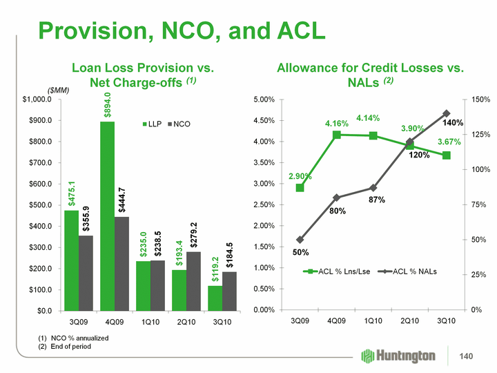 | (CHART) Provision, NCO, and ACL 140 ($MM) (1) NCO % annualizedEnd of period (CHART) Allowance for Credit Losses vs.NALs (2) Loan Loss Provision vs.Net Charge-offs (1) |