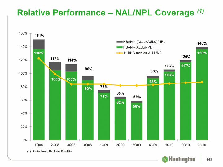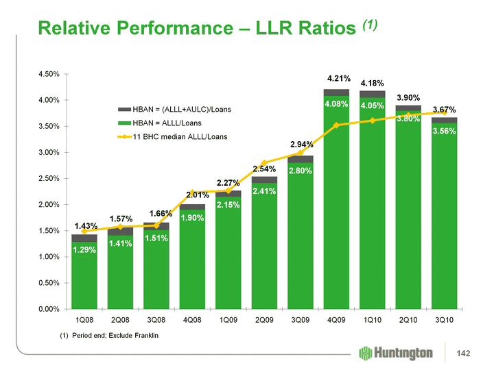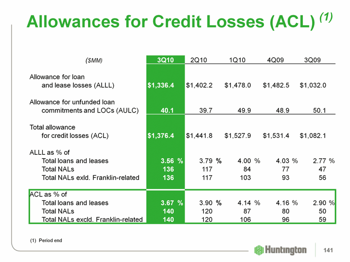 | Allowances for Credit Losses (ACL) (1) 141 ($MM) 3Q10 3Q10 2Q10 1Q10 4Q09 3Q09 Allowance for loan Allowance for loan and lease losses (ALLL) $1,336.4 $1,402.2 $1,478.0 $1,482.5 $1,032.0 Allowance for unfunded loan Allowance for unfunded loan commitments and LOCs (AULC) 40.1 39.7 49.9 48.9 50.1 Total allowance Total allowance for credit losses (ACL) $1,376.4 $1,441.8 $1,527.9 $1,531.4 $1,082.1 ALLL as % of ALLL as % of Total loans and leases 3.56 % 3.79 % 4.00 % 4.03 % 2.77 % Total NALs 136 117 84 77 47 Total NALs exld. Franklin-related 136 117 103 93 56 ACL as % of ACL as % of Total loans and leases 3.67 % 3.90 % 4.14 % 4.16 % 2.90 % Total NALs 140 120 87 80 50 Total NALs excld. Franklin-related 140 120 106 96 59 (1) Period end |