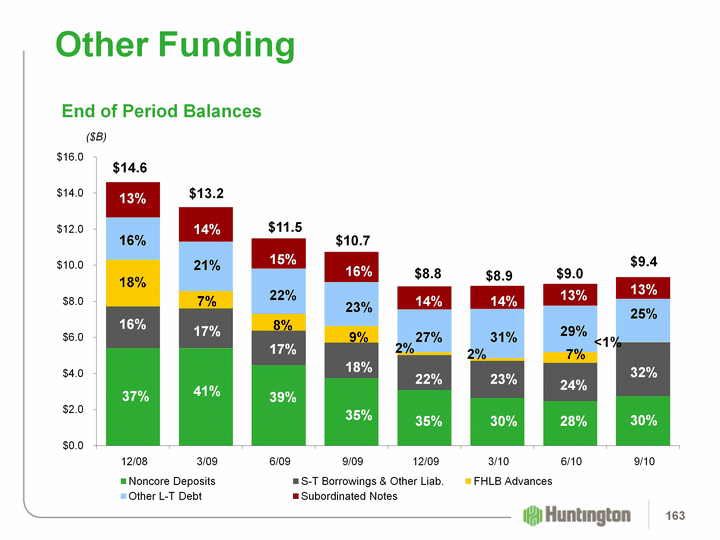 | (CHART) Other Funding 163 End of Period Balances ($B) $14.6 $13.2 $11.5 $10.7 13% 14% 22% 16% 16% 21% 15% 23% 9% 8% 7% 18% 35% 39% 41% 37% 18% 17% 17% 16% $8.8 14% 27% 2% 35% 22% $8.9 14% 31% 2% 30% 23% $9.0 13% 29% 7% 28% 24% $9.4 13% 25% <1% 30% 32% |