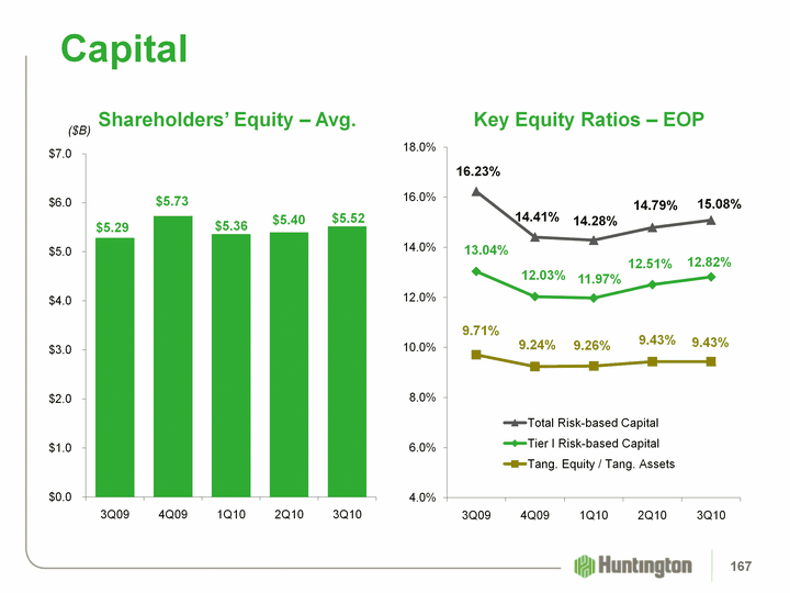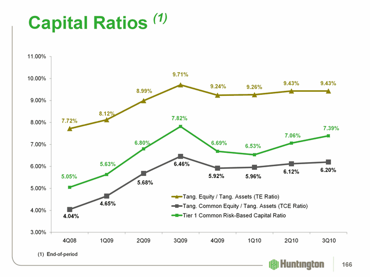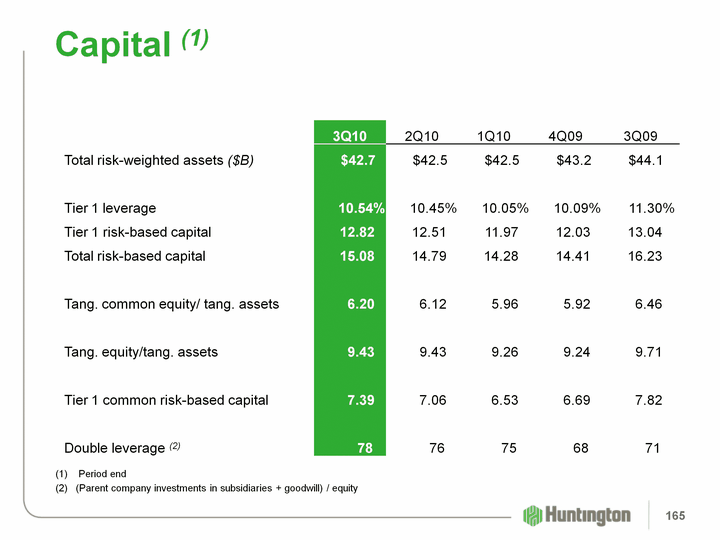 | Capital (1) 165 3Q10 2Q10 1Q10 4Q09 3Q09 Total risk-weighted assets ($B) $42.7 $42.5 $42.5 $43.2 $44.1 Tier 1 leverage 10.54% 10.45% 10.05% 10.09% 11.30% Tier 1 risk-based capital 12.82 12.51 11.97 12.03 13.04 Total risk-based capital 15.08 14.79 14.28 14.41 16.23 Tang. common equity/ tang. assets 6.20 6.12 5.96 5.92 6.46 Tang. equity/tang. assets 9.43 9.43 9.26 9.24 9.71 Tier 1 common risk-based capital 7.39 7.06 6.53 6.69 7.82 Double leverage (2) 78 76 75 68 71 (1) Period end (2) (Parent company investments in subsidiaries + goodwill) / equity |