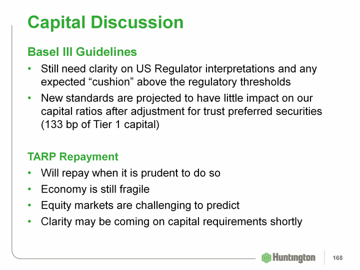 | Capital Discussion 168 Basel III GuidelinesStill need clarity on US Regulator interpretations and any expected "cushion" above the regulatory thresholdsNew standards are projected to have little impact on our capital ratios after adjustment for trust preferred securities (133 bp of Tier 1 capital)TARP RepaymentWill repay when it is prudent to do soEconomy is still fragileEquity markets are challenging to predictClarity may be coming on capital requirements shortly |