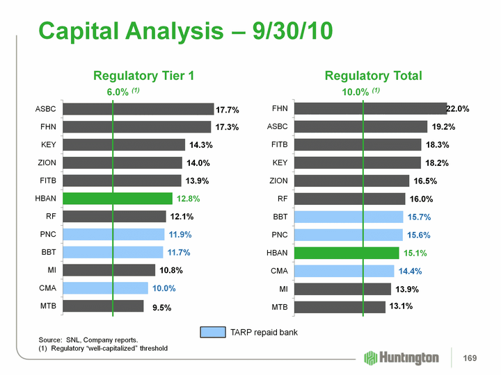 | (CHART) Capital Analysis - 9/30/10 169 (CHART) 6.0% (1) 10.0% (1) Source: SNL, Company reports. (1) Regulatory "well-capitalized" threshold Regulatory Total Regulatory Tier 1 TARP repaid bank |