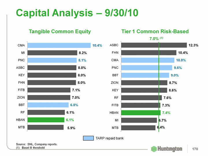 | (CHART) Capital Analysis - 9/30/10 170 (CHART) Source: SNL, Company reports.(1) Basel III threshold Tier 1 Common Risk-Based Tangible Common Equity TARP repaid bank 7.0% (1) |