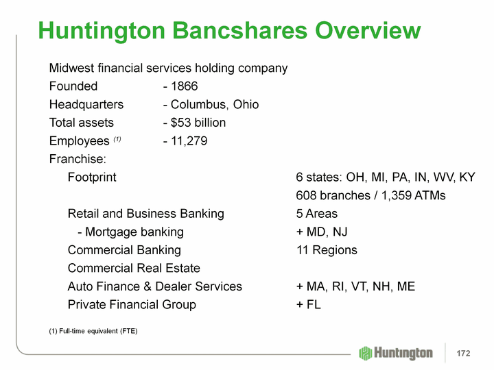 | Huntington Bancshares Overview 172 Midwest financial services holding companyFounded - 1866Headquarters - Columbus, OhioTotal assets - $53 billion Employees (1) - 11,279Franchise: Footprint 6 states: OH, MI, PA, IN, WV, KY 608 branches / 1,359 ATMs Retail and Business Banking 5 Areas - Mortgage banking + MD, NJ Commercial Banking 11 Regions Commercial Real Estate Auto Finance & Dealer Services + MA, RI, VT, NH, ME Private Financial Group + FL (1) Full-time equivalent (FTE) |