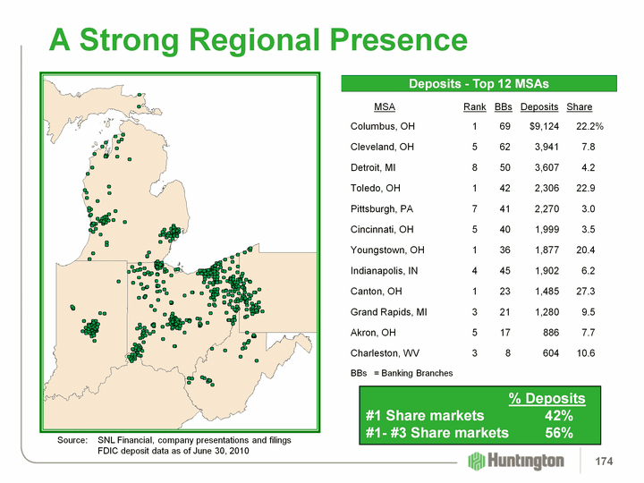 | A Strong Regional Presence 174 Source: SNL Financial, company presentations and filings FDIC deposit data as of June 30, 2010 Deposits - Top 12 MSAs MSA Rank BBs Deposits ShareColumbus, OH 1 69 $9,124 22.2%Cleveland, OH 5 62 3,941 7.8Detroit, MI 8 50 3,607 4.2Toledo, OH 1 42 2,306 22.9Pittsburgh, PA 7 41 2,270 3.0Cincinnati, OH 5 40 1,999 3.5Youngstown, OH 1 36 1,877 20.4Indianapolis, IN 4 45 1,902 6.2Canton, OH 1 23 1,485 27.3Grand Rapids, MI 3 21 1,280 9.5Akron, OH 5 17 886 7.7Charleston, WV 3 8 604 10.6BBs = Banking Branches % Deposits#1 Share markets 42% #1- #3 Share markets 56% |