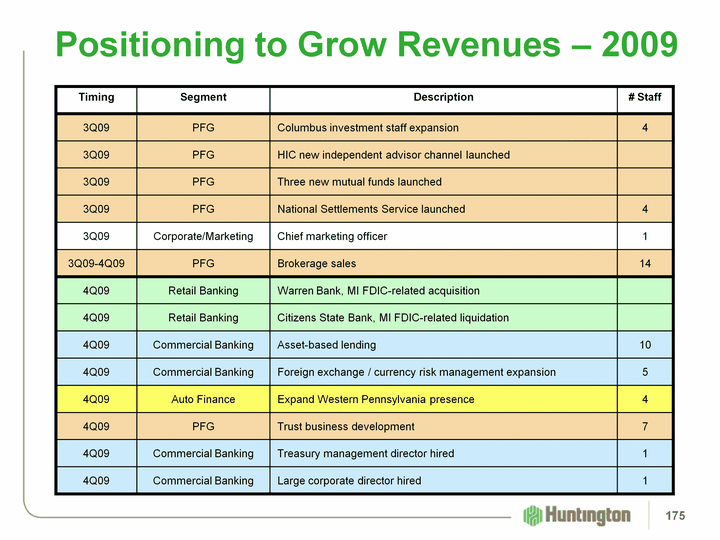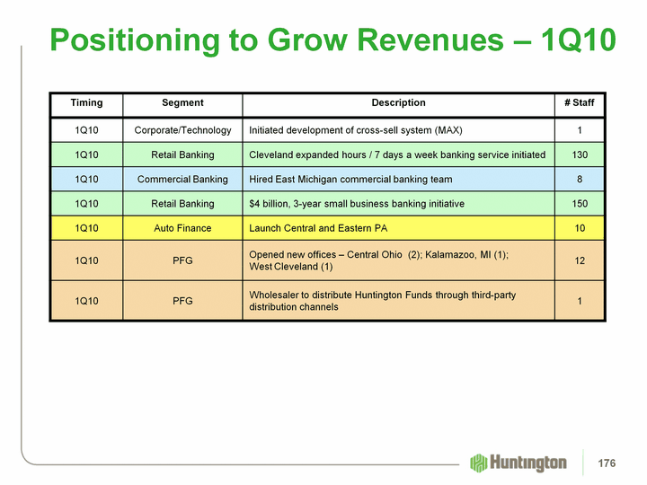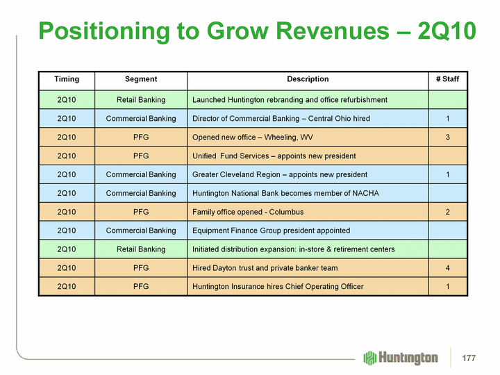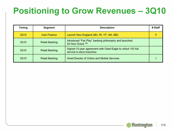 | Positioning to Grow Revenues - 2Q10 177 Timing Segment Description # Staff 2Q10 Retail Banking Launched Huntington rebranding and office refurbishment 2Q10 Commercial Banking Director of Commercial Banking - Central Ohio hired 1 2Q10 PFG Opened new office - Wheeling, WV 3 2Q10 PFG Unified Fund Services - appoints new president 2Q10 Commercial Banking Greater Cleveland Region - appoints new president 1 2Q10 Commercial Banking Huntington National Bank becomes member of NACHA 2Q10 PFG Family office opened - Columbus 2 2Q10 Commercial Banking Equipment Finance Group president appointed 2Q10 Retail Banking Initiated distribution expansion: in-store & retirement centers 2Q10 PFG Hired Dayton trust and private banker team 4 2Q10 PFG Huntington Insurance hires Chief Operating Officer 1 |