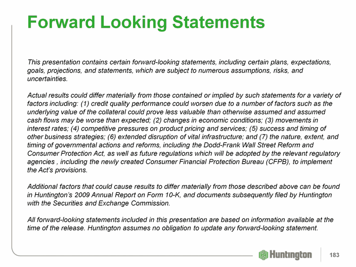 | This presentation contains certain forward-looking statements, including certain plans, expectations, goals, projections, and statements, which are subject to numerous assumptions, risks, and uncertainties.Actual results could differ materially from those contained or implied by such statements for a variety of factors including: (1) credit quality performance could worsen due to a number of factors such as the underlying value of the collateral could prove less valuable than otherwise assumed and assumed cash flows may be worse than expected; (2) changes in economic conditions; (3) movements in interest rates; (4) competitive pressures on product pricing and services; (5) success and timing of other business strategies; (6) extended disruption of vital infrastructure; and (7) the nature, extent, and timing of governmental actions and reforms, including the Dodd-Frank Wall Street Reform and Consumer Protection Act, as well as future regulations which will be adopted by the relevant regulatory agencies , including the newly created Consumer Financial Protection Bureau (CFPB), to implement the Act's provisions. Additional factors that could cause results to differ materially from those described above can be found in Huntington's 2009 Annual Report on Form 10-K, and documents subsequently filed by Huntington with the Securities and Exchange Commission.All forward-looking statements included in this presentation are based on information available at the time of the release. Huntington assumes no obligation to update any forward-looking statement. Forward Looking Statements 183 |