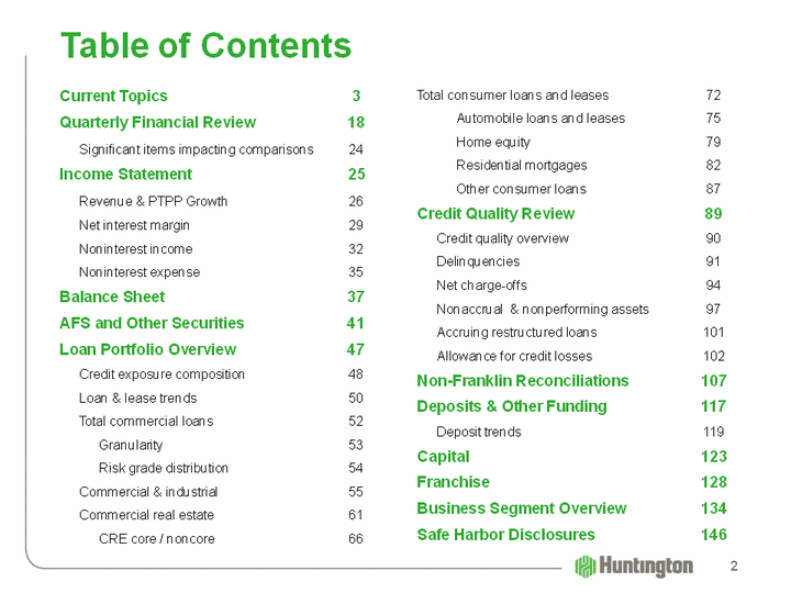 | Table of Contents Current Topics 3Quarterly Financial Review 18 Significant items impacting comparisons 24Income Statement 25 Revenue & PTPP Growth 26 Net interest margin 29 Noninterest income 32 Noninterest expense 35Balance Sheet 37AFS and Other Securities 41Loan Portfolio Overview 47 Credit exposure composition 48 Loan & lease trends 50 Total commercial loans 52 Granularity 53 Risk grade distribution 54 Commercial & industrial 55 Commercial real estate 61 CRE core / noncore 66 Total consumer loans and leases 72 Automobile loans and leases 75 Home equity 79 Residential mortgages 82 Other consumer loans 87Credit Quality Review 89 Credit quality overview 90 Delinquencies 91 Net charge-offs 94 Nonaccrual & nonperforming assets 97 Accruing restructured loans 101 Allowance for credit losses 102Non-Franklin Reconciliations 107Deposits & Other Funding 117 Deposit trends 119Capital 123Franchise 128Business Segment Overview 134Safe Harbor Disclosures 146 2 |