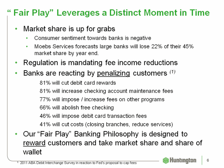 | The Strategic Plan: Positioned for Profitability and Growth Retail and Business Banking Commercial Banking Auto Finance Wealth Advisors, Gov't Finance, and Home Lending Investing for the Long Term 2010 2011 2009 Credit and Risk Management Strategic Plan 24-Hour Grace (r)Added 150 Sm Bus. BankersGiant Eagle / In-Store Asterisk-Free CheckingTMHuntington Plus CheckingTM Treasury ManagementEquipment LeasingCapital Markets Expand to Pennsylvania and New England Expand Personal Trust OfficesHuntington Asset Services Foundation of Service Common Sales Process: OCR / Cross Sell Building a Powerful Brand 5 |