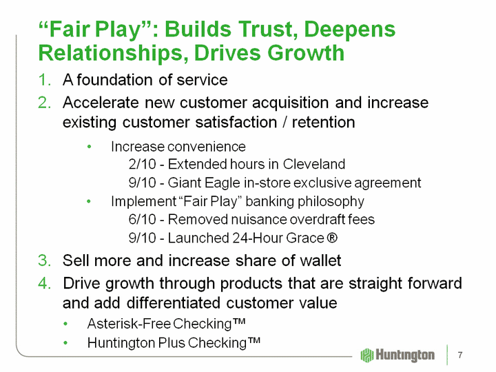| "Fair Play": Builds Trust, Deepens Relationships, Drives Growth A foundation of service Accelerate new customer acquisition and increase existing customer satisfaction / retentionSell more and increase share of walletDrive growth through products that are straight forward and add differentiated customer valueAsterisk-Free Checking(tm)Huntington Plus Checking(tm) 7 Increase convenience Increase convenience 2/10 - Extended hours in Cleveland 9/10 - Giant Eagle in-store exclusive agreement Implement "Fair Play" banking philosophy Implement "Fair Play" banking philosophy 6/10 - Removed nuisance overdraft fees 9/10 - Launched 24-Hour Grace (r) 7 |