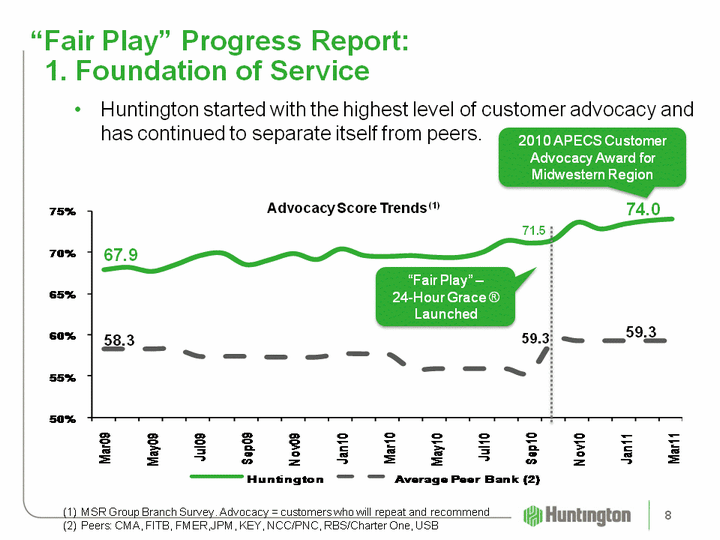 | "Fair Play" Progress Report: 1. Foundation of Service Huntington started with the highest level of customer advocacy and has continued to separate itself from peers. MSR Group Branch Survey. Advocacy = customers who will repeat and recommendPeers: CMA, FITB, FMER,JPM, KEY, NCC/PNC, RBS/Charter One, USB Advocacy Score Trends (1) 67.9 74.0 59.3 58.3 71.5 59.3 2010 APECS Customer Advocacy Award for Midwestern Region "Fair Play" - 24-Hour Grace (r) Launched 8 |