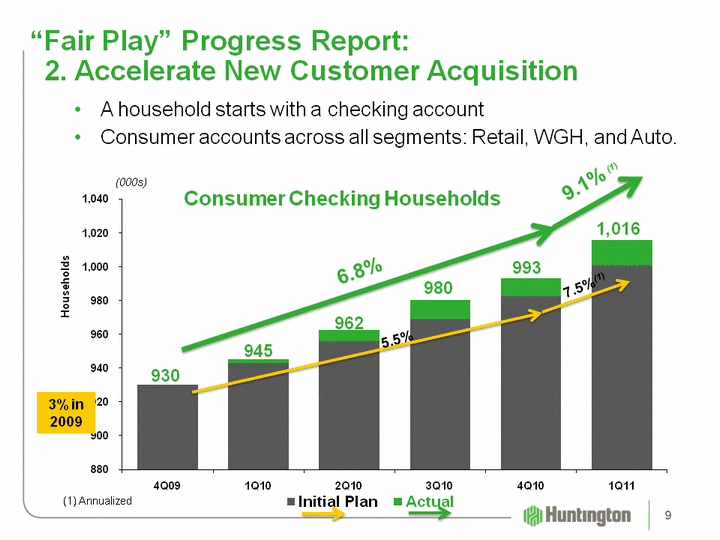 | (CHART) "Fair Play" Progress Report: 2. Accelerate New Customer Acquisition Consumer Checking Households 6.8% 9.1% (1) (1) Annualized A household starts with a checking accountConsumer accounts across all segments: Retail, WGH, and Auto. 3% in 2009 1,016 993 980 962 945 930 5.5% 7.5%(1) (000s) 9 |