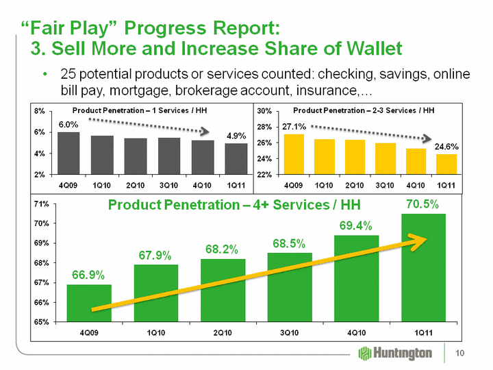 | (CHART) "Fair Play" Progress Report: 3. Sell More and Increase Share of Wallet Product Penetration - 4+ Services / HH 25 potential products or services counted: checking, savings, online bill pay, mortgage, brokerage account, insurance,... (CHART) (CHART) Product Penetration - 1 Services / HH Product Penetration - 2-3 Services / HH 10 |