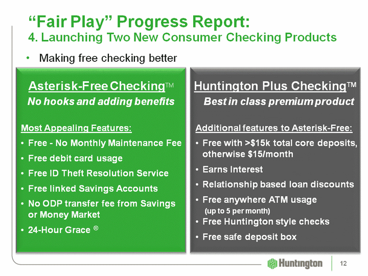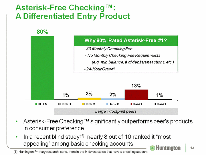 | Making free checking better "Fair Play" Progress Report: 4. Launching Two New Consumer Checking Products Asterisk-Free CheckingTMNo hooks and adding benefitsMost Appealing Features:Free - No Monthly Maintenance FeeFree debit card usageFree ID Theft Resolution ServiceFree linked Savings AccountsNo ODP transfer fee from Savings or Money Market24-Hour Grace (r) Huntington Plus CheckingTMBest in class premium product Additional features to Asterisk-Free:Free with >$15k total core deposits, otherwise $15/monthEarns InterestRelationship based loan discountsFree anywhere ATM usage (up to 5 per month)Free Huntington style checksFree safe deposit box 12 |
