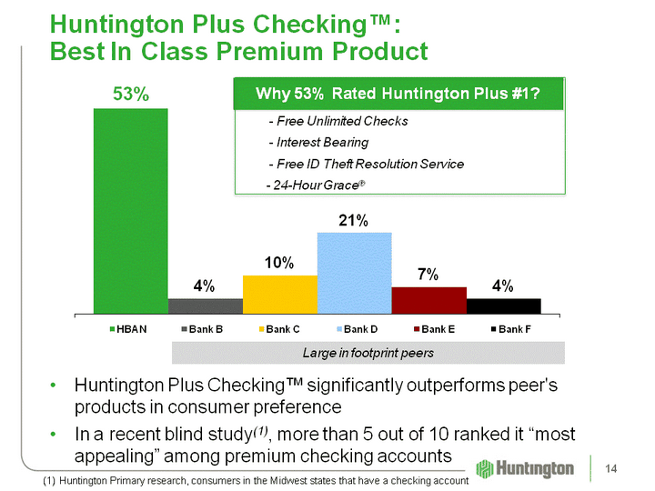 | Why 80% Rated Asterisk-Free #1? - $0 Monthly Checking Fee - No Monthly Checking Fee Requirements (e.g. min balance, # of debit transactions, etc.) - 24-Hour Grace(r) (CHART) Asterisk-Free Checking(tm): A Differentiated Entry Product Asterisk-Free Checking(tm) significantly outperforms peer's products in consumer preferenceIn a recent blind study(1), nearly 8 out of 10 ranked it "most appealing" among basic checking accounts Large in footprint peers Huntington Primary research, consumers in the Midwest states that have a checking account 13 |