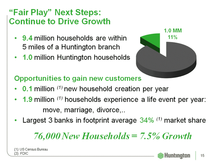 | "Fair Play" Next Steps: Continue to Drive Growth US Census Bureau FDIC 9.4 million households are within 5 miles of a Huntington branch1.0 million Huntington householdsOpportunities to gain new customers0.1 million (1) new household creation per year1.9 million (1) households experience a life event per year: move, marriage, divorce,..Largest 3 banks in footprint average 34% (1) market share76,000 New Households = 7.5% Growth (CHART) 1.0 MM 11% 15 |