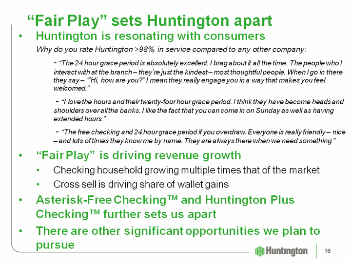 | "Fair Play" sets Huntington apart Huntington is resonating with consumersWhy do you rate Huntington >98% in service compared to any other company: - "The 24 hour grace period is absolutely excellent. I brag about it all the time. The people who I interact with at the branch - they're just the kindest - most thoughtful people. When I go in there they say - ""Hi, how are you?" I mean they really engage you in a way that makes you feel welcomed." - "I love the hours and their twenty-four hour grace period. I think they have become heads and shoulders over all the banks. I like the fact that you can come in on Sunday as well as having extended hours." - "The free checking and 24 hour grace period if you overdraw. Everyone is really friendly - nice - and lots of times they know me by name. They are always there when we need something.""Fair Play" is driving revenue growthChecking household growing multiple times that of the marketCross sell is driving share of wallet gainsAsterisk-Free Checking(tm) and Huntington Plus Checking(tm) further sets us apartThere are other significant opportunities we plan to pursue 16 16 |