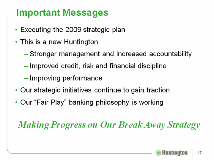 | Important Messages Executing the 2009 strategic planThis is a new HuntingtonStronger management and increased accountability Improved credit, risk and financial discipline Improving performanceOur strategic initiatives continue to gain tractionOur "Fair Play" banking philosophy is workingMaking Progress on Our Break Away Strategy 17 |