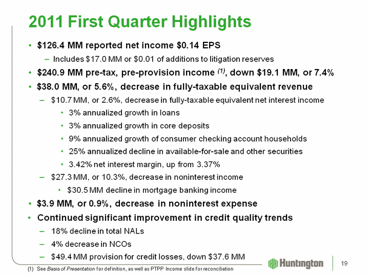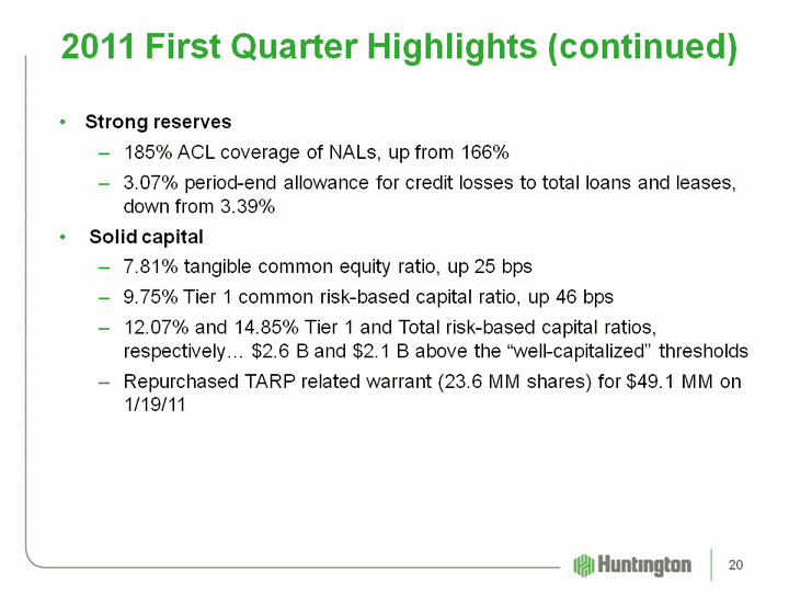 | $126.4 MM reported net income $0.14 EPSIncludes $17.0 MM or $0.01 of additions to litigation reserves$240.9 MM pre-tax, pre-provision income (1), down $19.1 MM, or 7.4%$38.0 MM, or 5.6%, decrease in fully-taxable equivalent revenue$10.7 MM, or 2.6%, decrease in fully-taxable equivalent net interest income3% annualized growth in loans3% annualized growth in core deposits9% annualized growth of consumer checking account households25% annualized decline in available-for-sale and other securities3.42% net interest margin, up from 3.37%$27.3 MM, or 10.3%, decrease in noninterest income$30.5 MM decline in mortgage banking income$3.9 MM, or 0.9%, decrease in noninterest expenseContinued significant improvement in credit quality trends18% decline in total NALs4% decrease in NCOs$49.4 MM provision for credit losses, down $37.6 MM 2011 First Quarter Highlights See Basis of Presentation for definition, as well as PTPP Income slide for reconciliation 19 |