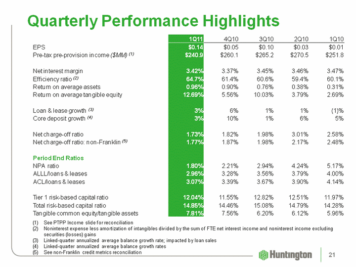 | Strong reserves 185% ACL coverage of NALs, up from 166%3.07% period-end allowance for credit losses to total loans and leases, down from 3.39%Solid capital7.81% tangible common equity ratio, up 25 bps9.75% Tier 1 common risk-based capital ratio, up 46 bps12.07% and 14.85% Tier 1 and Total risk-based capital ratios, respectively... $2.6 B and $2.1 B above the "well-capitalized" thresholdsRepurchased TARP related warrant (23.6 MM shares) for $49.1 MM on 1/19/11 2011 First Quarter Highlights (continued) 20 |
