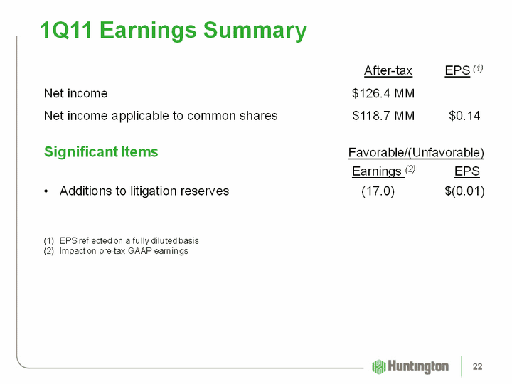 | Quarterly Performance Highlights 1Q11 4Q10 3Q10 2Q10 1Q10 EPS $0.14 $0.05 $0.10 $0.03 $0.01 Pre-tax pre-provision income ($MM) (1) $240.9 $260.1 $265.2 $270.5 $251.8 Net interest margin 3.42% 3.37% 3.45% 3.46% 3.47% Efficiency ratio (2) 64.7% 61.4% 60.6% 59.4% 60.1% Return on average assets 0.96% 0.90% 0.76% 0.38% 0.31% Return on average tangible equity 12.69% 5.56% 10.03% 3.79% 2.69% Loan & lease growth (3) 3% 6% 1% 1% (1)% Core deposit growth (4) 3% 10% 1% 6% 5% Net charge-off ratio 1.73% 1.82% 1.98% 3.01% 2.58% Net charge-off ratio: non-Franklin (5) 1.77% 1.87% 1.98% 2.17% 2.48% Period End Ratios NPA ratio 1.80% 2.21% 2.94% 4.24% 5.17% ALLL/loans & leases 2.96% 3.28% 3.56% 3.79% 4.00% ACL/loans & leases 3.07% 3.39% 3.67% 3.90% 4.14% Tier 1 risk-based capital ratio 12.04% 11.55% 12.82% 12.51% 11.97% Total risk-based capital ratio 14.85% 14.46% 15.08% 14.79% 14.28% Tangible common equity/tangible assets 7.81% 7.56% 6.20% 6.12% 5.96% (1) See PTPP Income slide for reconciliation(2) Noninterest expense less amortization of intangibles divided by the sum of FTE net interest income and noninterest income excluding securities (losses) gains(3) Linked-quarter annualized average balance growth rate; impacted by loan sales(4) Linked-quarter annualized average balance growth rates (5) See non-Franklin credit metrics reconciliation 21 |