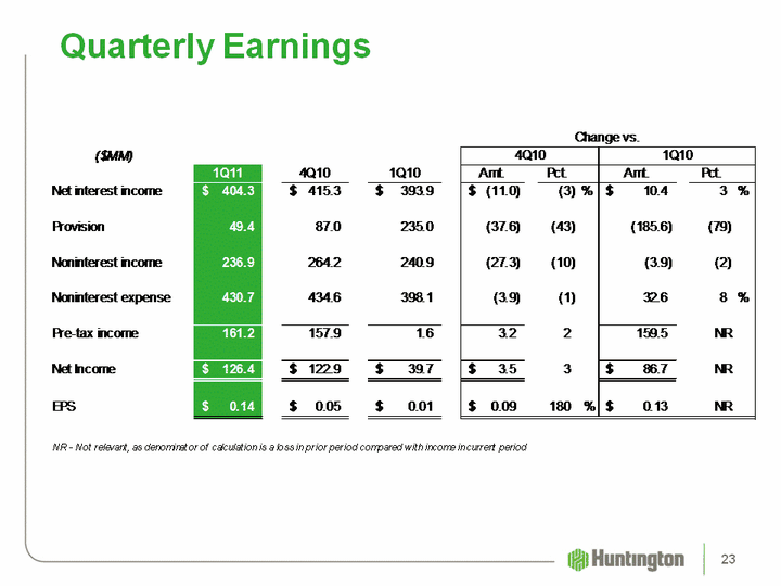 | 1Q11 Earnings Summary After-tax EPS (1)Net income $126.4 MM Net income applicable to common shares $118.7 MM $0.14Significant Items Favorable/(Unfavorable) Earnings (2) EPS Additions to litigation reserves (17.0) $(0.01)(1) EPS reflected on a fully diluted basis(2) Impact on pre-tax GAAP earnings 22 |