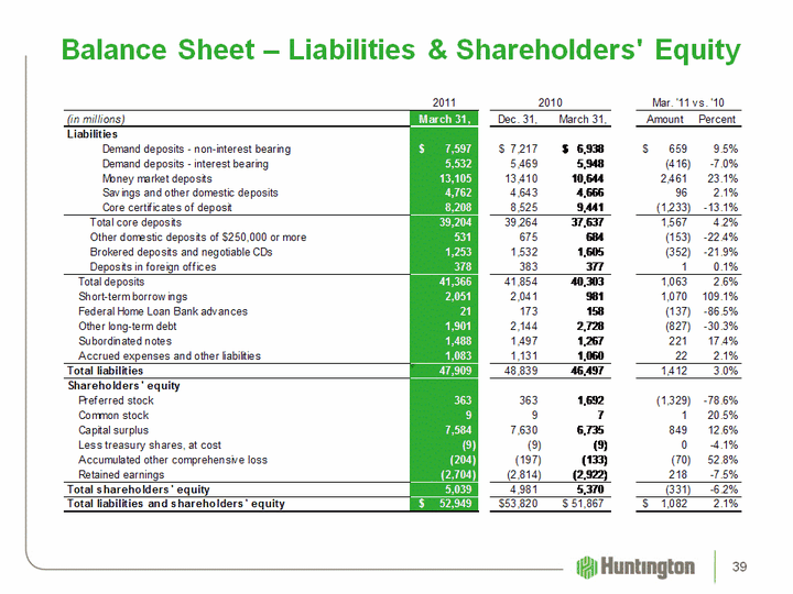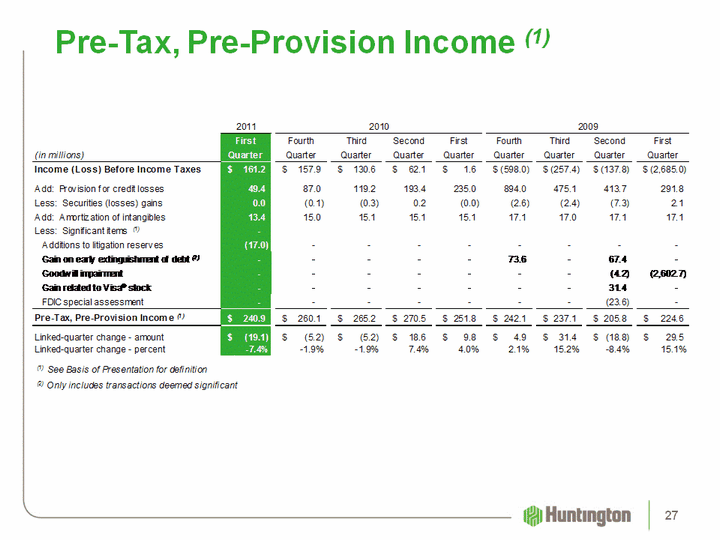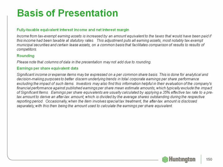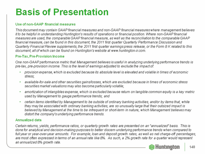 | Use of non-GAAP financial measuresThis document may contain GAAP financial measures and non-GAAP financial measures where management believes it to be helpful in understanding Huntington's results of operations or financial position. Where non-GAAP financial measures are used, the comparable GAAP financial measure, as well as the reconciliation to the comparable GAAP financial measure, can be found in this document, the 2011 first quarter Quarterly Performance Discussion and Quarterly Financial Review supplements, the 2011 first quarter earnings press release, or the Form 8 K related to this document, all of which can be found on Huntington's website at www.huntington-ir.com.Pre-Tax, Pre-Provision IncomeOne non-GAAP performance metric that Management believes is useful in analyzing underlying performance trends is pre-tax, pre-provision income. This is the level of earnings adjusted to exclude the impact of:provision expense, which is excluded because its absolute level is elevated and volatile in times of economic stress;available-for-sale and other securities gains/losses, which are excluded because in times of economic stress securities market valuations may also become particularly volatile;amortization of intangibles expense, which is excluded because return on tangible common equity is a key metric used by Management to gauge performance trends; and certain items identified by Management to be outside of ordinary banking activities, and/or by items that, while they may be associated with ordinary banking activities, are so unusually large that their outsized impact is believed by Management at the time to be infrequent or short-term in nature, which Management believes may distort the company's underlying performance trends.Annualized dataCertain returns, yields, performance ratios, or quarterly growth rates are presented on an "annualized" basis. This is done for analytical and decision-making purposes to better discern underlying performance trends when compared to full year or year-over-year amounts. For example, loan and deposit growth rates, as well as net charge-off percentages, are most often expressed in terms of an annual rate like 8%. As such, a 2% growth rate for a quarter would represent an annualized 8% growth rate. Basis of Presentation 148 |