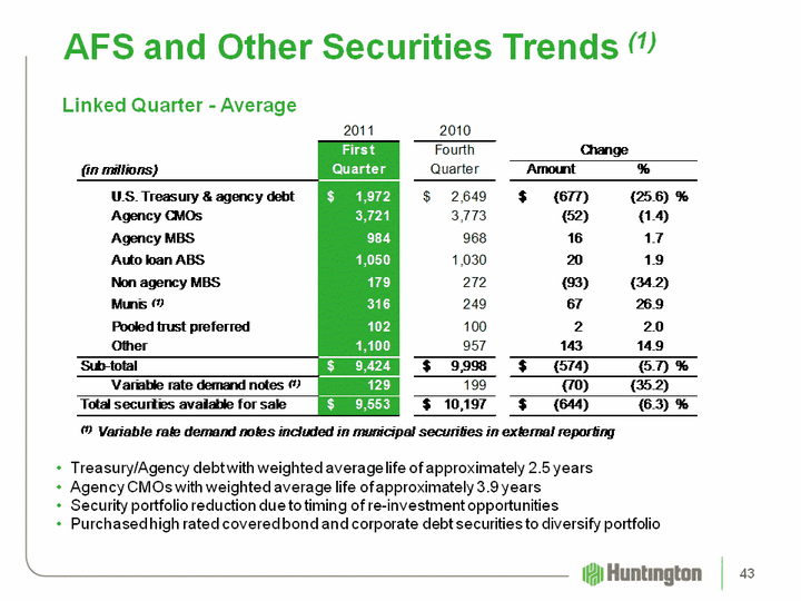 | AFS and Other Securities Trends (1) Linked Quarter - Average Treasury/Agency debt with weighted average life of approximately 2.5 yearsAgency CMOs with weighted average life of approximately 3.9 yearsSecurity portfolio reduction due to timing of re-investment opportunitiesPurchased high rated covered bond and corporate debt securities to diversify portfolio 43 |