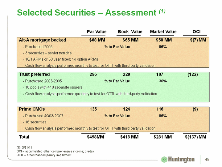 | Selected Securities - Assessment (1) Par Value Book Value Market Value OCIAlt-A mortgage backed $68 MM $65 MM $58 MM $(7) MM - Purchased 2006 % to Par Value 86% - 3 securities - senior tranche - 10/1 ARMs or 30 year fixed; no option ARMs - Cash flow analysis performed monthly to test for OTTI with third-party validationTrust preferred 296 229 107 (122) - Purchased 2003-2005 % to Par Value 36% - 16 pools with 410 separate issuers - Cash flow analysis performed quarterly to test for OTTI with third-party validationPrime CMOs 135 124 116 (9) - Purchased 4Q03-2Q07 % to Par Value 86% - 16 securities - Cash flow analysis performed monthly to test for OTTI with third-party validationTotal $498MM $418 MM $281 MM $(137) MM 3/31/11OCI - accumulated other comprehensive income; pre-taxOTTI - other-than-temporary impairment 45 |