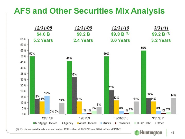 | (CHART) AFS and Other Securities Mix Analysis 12/31/10$9.8 B (1)3.0 Years 12/31/08$4.0 B5.2 Years 12/31/09$8.2 B2.4 Years Excludes variable rate demand notes: $139 million at 12/31/10 and $124 million at 3/31/31 (1) 3/31/11$9.2 B (1)3.2 Years 46 |