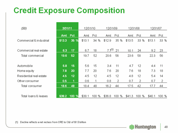 | ($B) 3/31/11 3/31/11 3/31/11 12/31/10 12/31/10 12/31/10 12/31/09 12/31/09 12/31/09 12/31/08 12/31/08 12/31/08 12/31/07 12/31/07 12/31/07 Amt Pct Amt Pct Amt Pct Amt Pct Amt Pct Commercial & industrial $13.3 35 % $13.1 34 % $12.9 35 % $13.5 33 % $13.1 33 % Commercial real estate 6.3 17 6.7 18 7.7 21 10.1 24 9.2 23 Total commercial 19.6 52 19.7 52 20.6 56 23.6 58 22.3 56 Automobile 5.8 15 5.6 15 3.4 11 4.7 12 4.4 11 Home equity 7.8 20 7.7 20 7.6 20 7.6 18 7.3 18 Residential real estate 4.5 12 4.5 12 4.5 12 4.8 12 5.4 14 Other consumer 0.5 1 0.6 1 0.8 2 0.7 2 0.7 2 Total consumer 18.6 48 18.4 48 16.2 44 17.5 42 17.7 44 Total loans & leases $38.2 100 % $38.1 100 % $36.8 100 % $41.3 100 % $40.1 100 % Credit Exposure Composition (1) Decline reflects a net reclass from CRE to C&I of $1.5 billion (1) 48 |