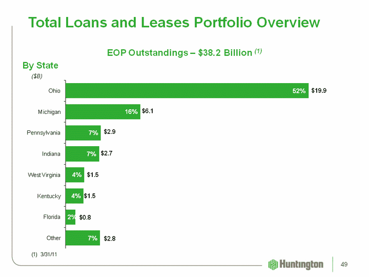 | (CHART) Total Loans and Leases Portfolio Overview ($B) $19.9 $6.1 $2.9 $1.5 $2.7 $1.5 $0.8 $2.8 EOP Outstandings - $38.2 Billion (1) (1) 3/31/11 By State 49 |