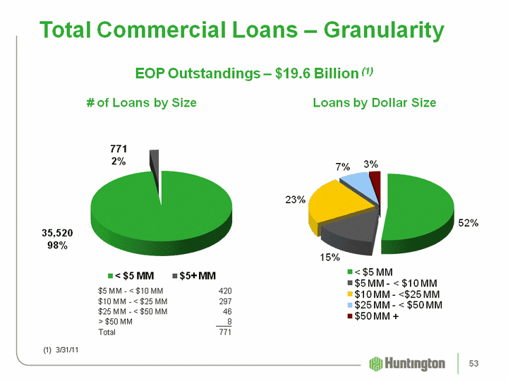| (CHART) Total Commercial Loans - Granularity EOP Outstandings - $19.6 Billion (1) (CHART) 771 2% 35,52098% (1) 3/31/11 Loans by Dollar Size # of Loans by Size $5 MM - < $10 MM 420$10 MM - < $25 MM 297$25 MM - < $50 MM 46> $50 MM 8Total 771 53 |