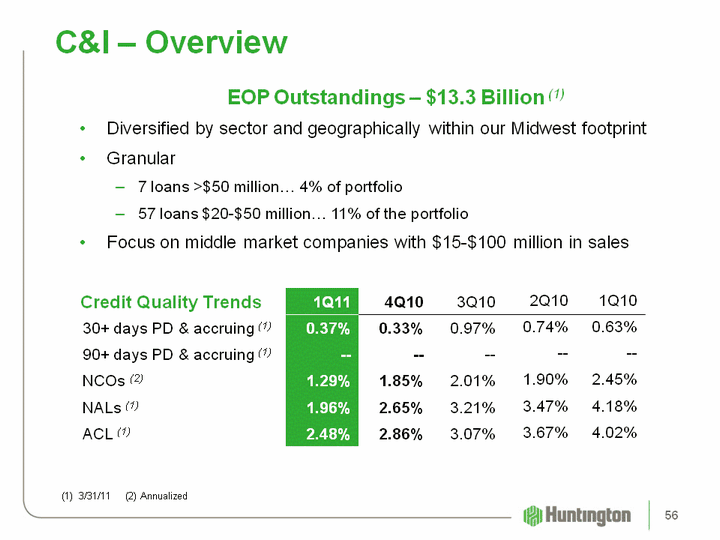 | C&I - Overview EOP Outstandings - $13.3 Billion (1)Diversified by sector and geographically within our Midwest footprintGranular7 loans >$50 million... 4% of portfolio57 loans $20-$50 million... 11% of the portfolioFocus on middle market companies with $15-$100 million in salesCredit Quality Trends (1) 3/31/11 (2) Annualized 1Q11 4Q10 3Q10 2Q10 1Q10 30+ days PD & accruing (1) 0.37% 0.33% 0.97% 0.74% 0.63% 90+ days PD & accruing (1) -- -- -- -- -- NCOs (2) 1.29% 1.85% 2.01% 1.90% 2.45% NALs (1) 1.96% 2.65% 3.21% 3.47% 4.18% ACL (1) 2.48% 2.86% 3.07% 3.67% 4.02% 56 |