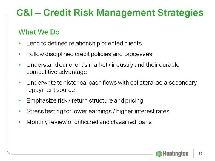 | C&I - Credit Risk Management Strategies What We DoLend to defined relationship oriented clientsFollow disciplined credit policies and processesUnderstand our client's market / industry and their durable competitive advantageUnderwrite to historical cash flows with collateral as a secondary repayment sourceEmphasize risk / return structure and pricingStress testing for lower earnings / higher interest ratesMonthly review of criticized and classified loans 57 |