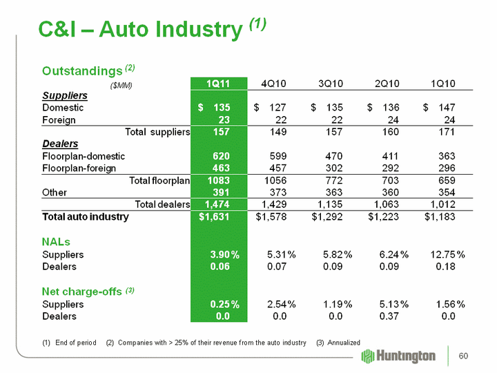 | C&I - Auto Industry (1) Outstandings (2) ($MM) 1Q11 4Q10 3Q10 2Q10 1Q10 Suppliers Domestic $ 135 $ 127 $ 135 $ 136 $ 147 Foreign 23 22 22 24 24 Total suppliers 157 149 157 160 171 Dealers Floorplan-domestic 620 599 470 411 363 Floorplan-foreign 463 457 302 292 296 Total floorplan 1083 1056 772 703 659 Other 391 373 363 360 354 Total dealers 1,474 1,429 1,135 1,063 1,012 Total auto industry $1,631 $1,578 $1,292 $1,223 $1,183 NALs Suppliers 3.90 % 5.31 % 5.82 % 6.24 % 12.75 % Dealers 0.06 0.07 0.09 0.09 0.18 Net charge-offs (3) Suppliers 0.25 % 2.54 % 1.19 % 5.13 % 1.56 % Dealers 0.0 0.0 0.0 0.37 0.0 (1) End of period (2) Companies with > 25% of their revenue from the auto industry (3) Annualized 60 |