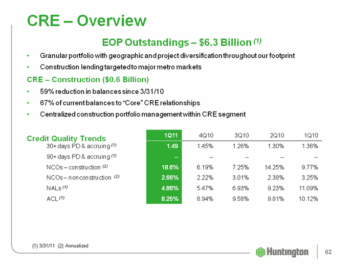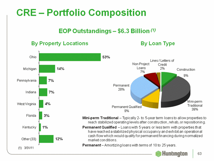 | CRE - Overview EOP Outstandings - $6.3 Billion (1)Granular portfolio with geographic and project diversification throughout our footprintConstruction lending targeted to major metro marketsCRE - Construction ($0.6 Billion)59% reduction in balances since 3/31/1067% of current balances to "Core" CRE relationshipsCentralized construction portfolio management within CRE segmentCredit Quality Trends (1) 3/31/11 (2) Annualized 1Q11 4Q10 3Q10 2Q10 1Q10 30+ days PD & accruing (1) 1.49 1.45% 1.26% 1.30% 1.36% 90+ days PD & accruing (1) -- -- -- -- -- NCOs - construction (2) 18.6% 6.19% 7.25% 14.25% 9.77% NCOs - nonconstruction (2) 2.66% 2.22% 3.01% 2.38% 3.25% NALs (1) 4.86% 5.47% 6.93% 9.23% 11.09% ACL (1) 8.25% 8.94% 9.58% 9.81% 10.12% 62 |