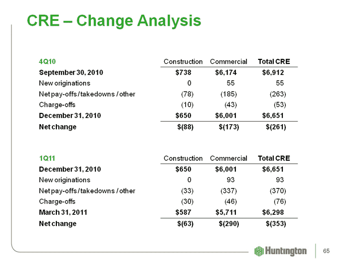 | (CHART) CRE - Trends ($MM) Change Analysis Period-End Balance ($MM) 1Q11 vs. 4Q10 1Q11 vs. 1Q10 Originations $ 93 $ 260 Takedowns 124 617 Net payments / payoffs / other (458) (1,873) Net reclassifications (36) 133 Charge-offs (76) (295) Net change $(353) $(1,158) (5.3)% (15.5)% 64 |
