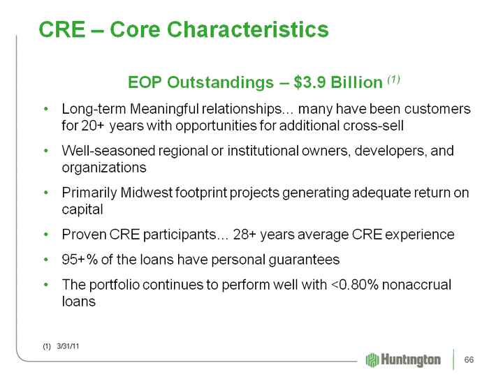 | CRE - Change Analysis 4Q10 Construction Commercial Total CRE September 30, 2010 $738 $6,174 $6,912 New originations 0 55 55 Net pay-offs / takedowns / other (78) (185) (263) Charge-offs (10) (43) (53) December 31, 2010 $650 $6,001 $6,651 Net change $(88) $(173) $(261) 1Q11 Construction Commercial Total CRE December 31, 2010 $650 $6,001 $6,651 New originations 0 93 93 Net pay-offs / takedowns / other (33) (337) (370) Charge-offs (30) (46) (76) March 31, 2011 $587 $5,711 $6,298 Net change $(63) $(290) $(353) 65 |