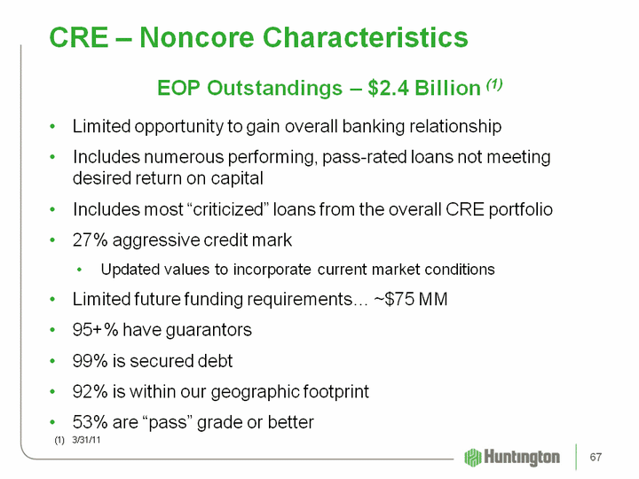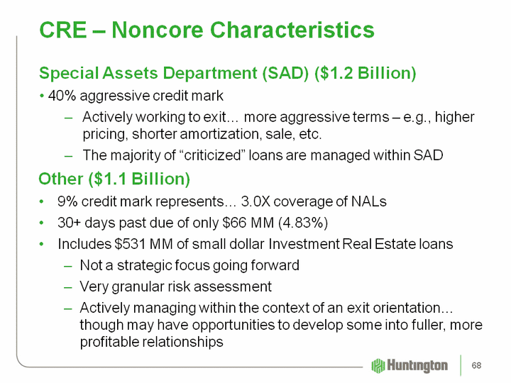 | CRE - Noncore Characteristics EOP Outstandings - $2.4 Billion (1)Limited opportunity to gain overall banking relationshipIncludes numerous performing, pass-rated loans not meeting desired return on capitalIncludes most "criticized" loans from the overall CRE portfolio27% aggressive credit markUpdated values to incorporate current market conditionsLimited future funding requirements... ~$75 MM95+% have guarantors99% is secured debt92% is within our geographic footprint53% are "pass" grade or better (1) 3/31/11 67 |