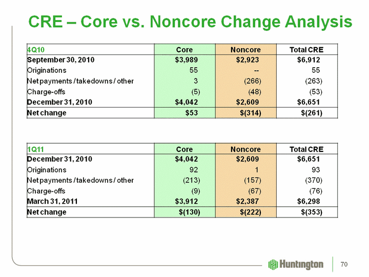 | CRE - Core vs. Noncore Change Analysis 4Q10 Core Noncore Total CRE September 30, 2010 $3,989 $2,923 $6,912 Originations 55 -- 55 Net payments / takedowns / other 3 (266) (263) Charge-offs (5) (48) (53) December 31, 2010 $4,042 $2,609 $6,651 Net change $53 $(314) $(261) 1Q11 Core Noncore Total CRE December 31, 2010 $4,042 $2,609 $6,651 Originations 92 1 93 Net payments / takedowns / other (213) (157) (370) Charge-offs (9) (67) (76) March 31, 2011 $3,912 $2,387 $6,298 Net change $(130) $(222) $(353) 70 |