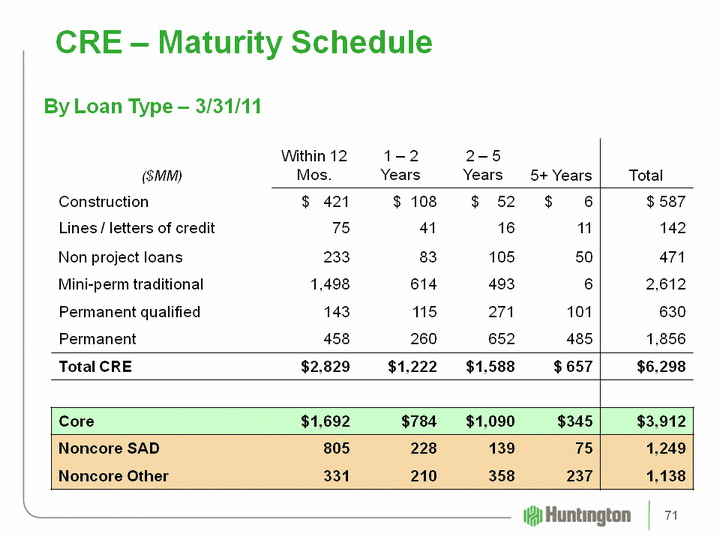 | CRE - Maturity Schedule By Loan Type - 3/31/11 ($MM) Within 12 Mos. 1 - 2 Years 2 - 5 Years 5+ Years Total Construction $ 421 $ 108 $ 52 $ 6 $ 587 Lines / letters of credit 75 41 16 11 142 Non project loans 233 83 105 50 471 Mini-perm traditional 1,498 614 493 6 2,612 Permanent qualified 143 115 271 101 630 Permanent 458 260 652 485 1,856 Total CRE $2,829 $1,222 $1,588 $ 657 $6,298 Core $1,692 $784 $1,090 $345 $3,912 Noncore SAD 805 228 139 75 1,249 Noncore Other 331 210 358 237 1,138 71 |